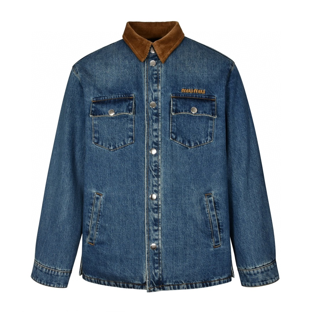 MIU MIU 缪缪 灯芯绒领logo徽标牛仔外套 棉服 夹克 外套 长袖 蓝色 GWB234-1575-F0008-S-OOO